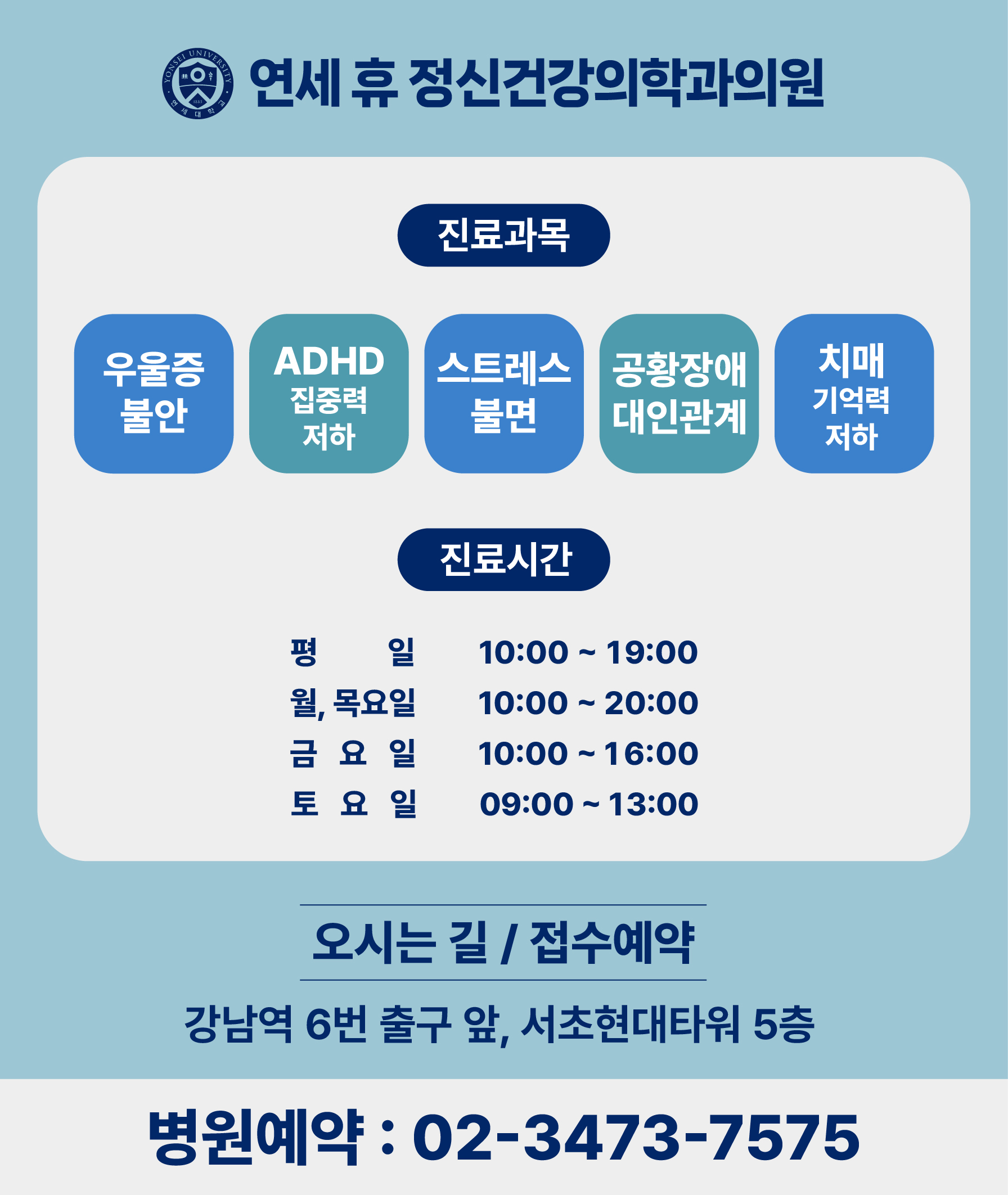 [강남역 연세 휴 정신건강의학과] :: 2026년 2월 진료 일정 안내 * 토요일 진료 일정-김세범 원장: 2월 7, 28일-손정현 원장: 2월 14일-윤희우 원장: 2월 21일*휴진 일정-2월 16-18일(월-수) : 설날 연휴 휴진* 평일 점심시간: 13시~14시* 토요일 진료는 점심 시간 없이 9시-13시까지예약 및 궁금하신 점은 02-3473-7575로 문의 주세요. 감사합니다.