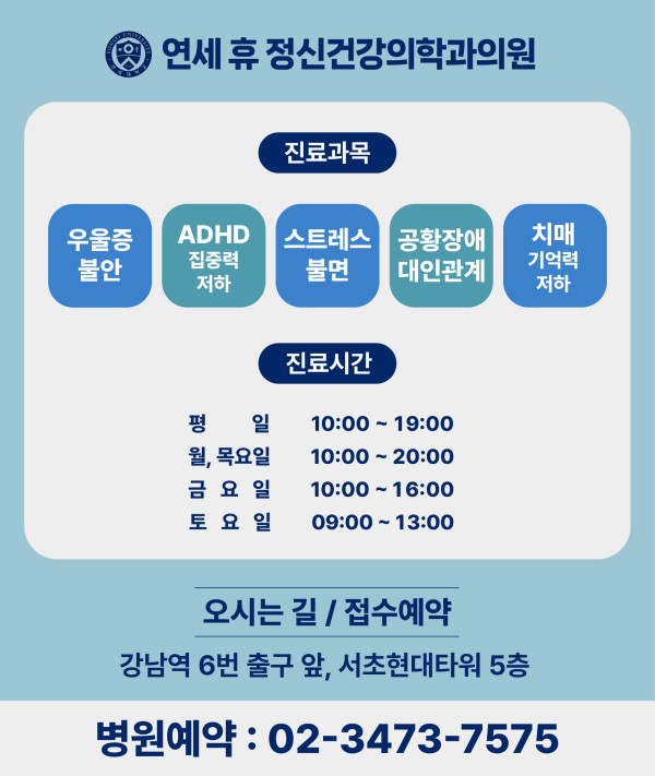 [강남역 연세 휴 정신건강의학과] :: 2026년 2월 진료 일정 안내 * 토요일 진료 일정-김세범 원장: 2월 7, 28일-손정현 원장: 2월 14일-윤희우 원장: 2월 21일*휴진 일정-2월 16-18일(월-수) : 설날 연휴 휴진* 평일 점심시간: 13시~14시* 토요일 진료는 점심 시간 없이 9시-13시까지예약 및 궁금하신 점은 02-3473-7575로 문의 주세요. 감사합니다.